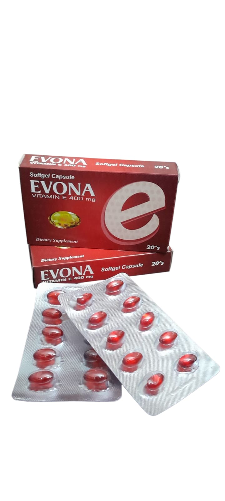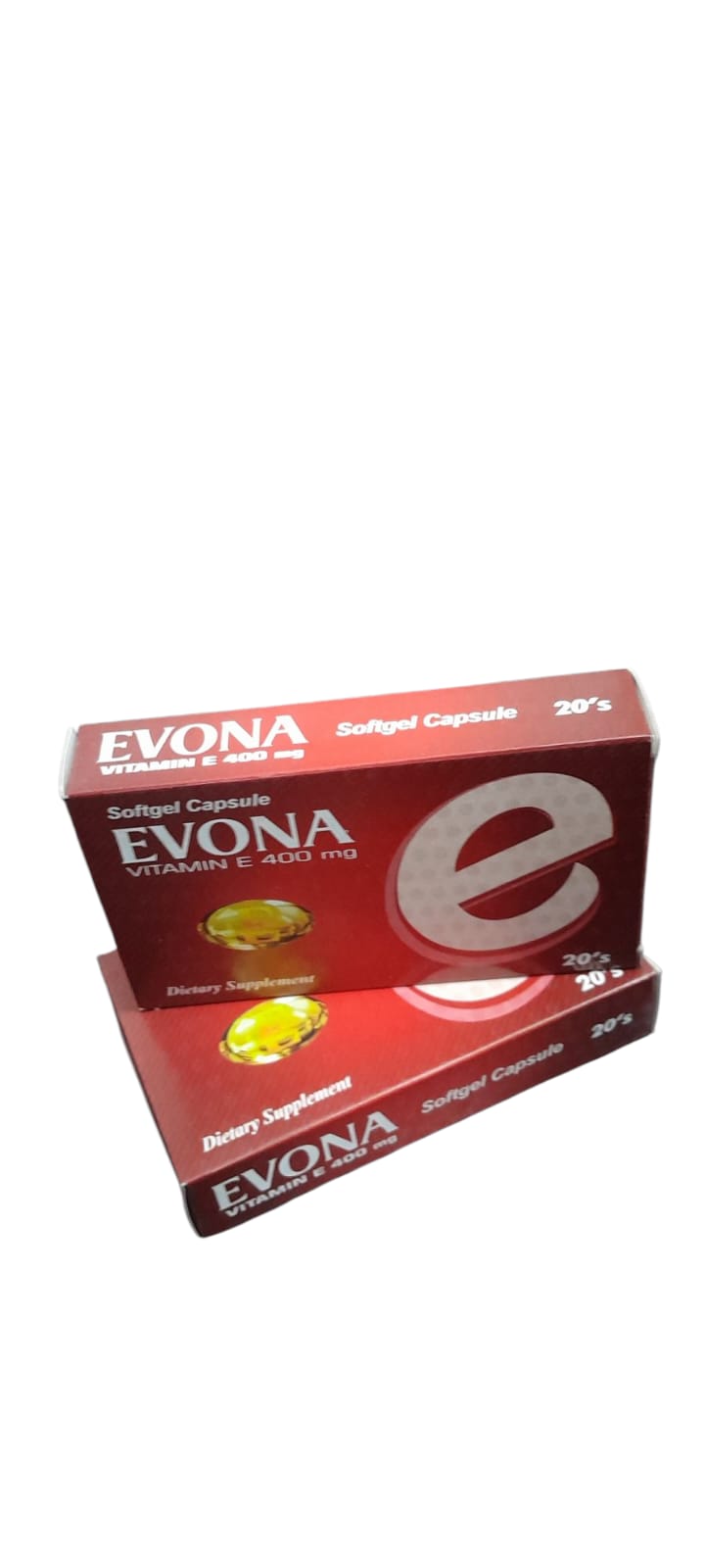 Evona Vitamin E 400 mg soft gel capsules are used as a dietary supplement. Vitamin E functions as an antioxidant, supports the immune system, helps form red blood cells, and aids in the utilization of vitamin K.