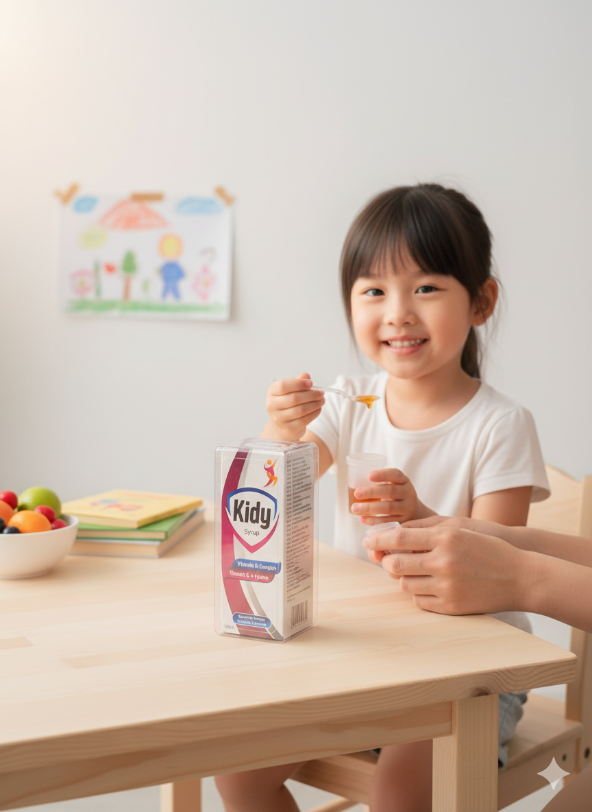 Kidy Syrup – A multivitamin supplement designed for children. Enriched with *Vitamin B-Complex, Vitamin C, and Lysine*, it helps *boost appetite, support healthy growth, and strengthen immunity*. Comes in a 120ml bottle, ideal for daily use in growing kids.