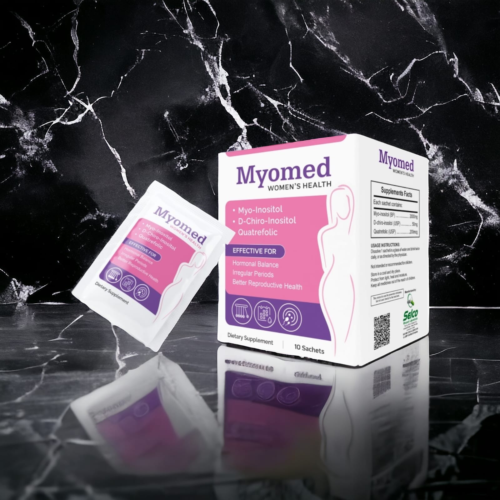 Myomed is a dietary supplement containing Myo-Inositol, D-Chiro-Inositol, and Quatrefolic to support hormonal balance, ovarian function, and fertility. It is specially formulated to help manage PCOS symptoms, regulate menstrual cycles, improve insulin sensitivity, and enhance preconception health. Suitable for women experiencing irregular periods, ovulation issues, or metabolic disorders.