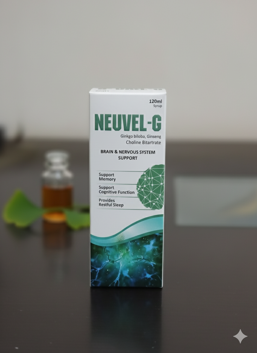 Neuvel -g Syrup designed to enhance brain function, improve memory, concentration, and mental performance. It contains Ginkgo Biloba, and Ginseng, supporting overall well-being, physical performance, and immune health. It is beneficial for both children and adults, helping to manage cholesterol and weight levels while promoting cognitive health