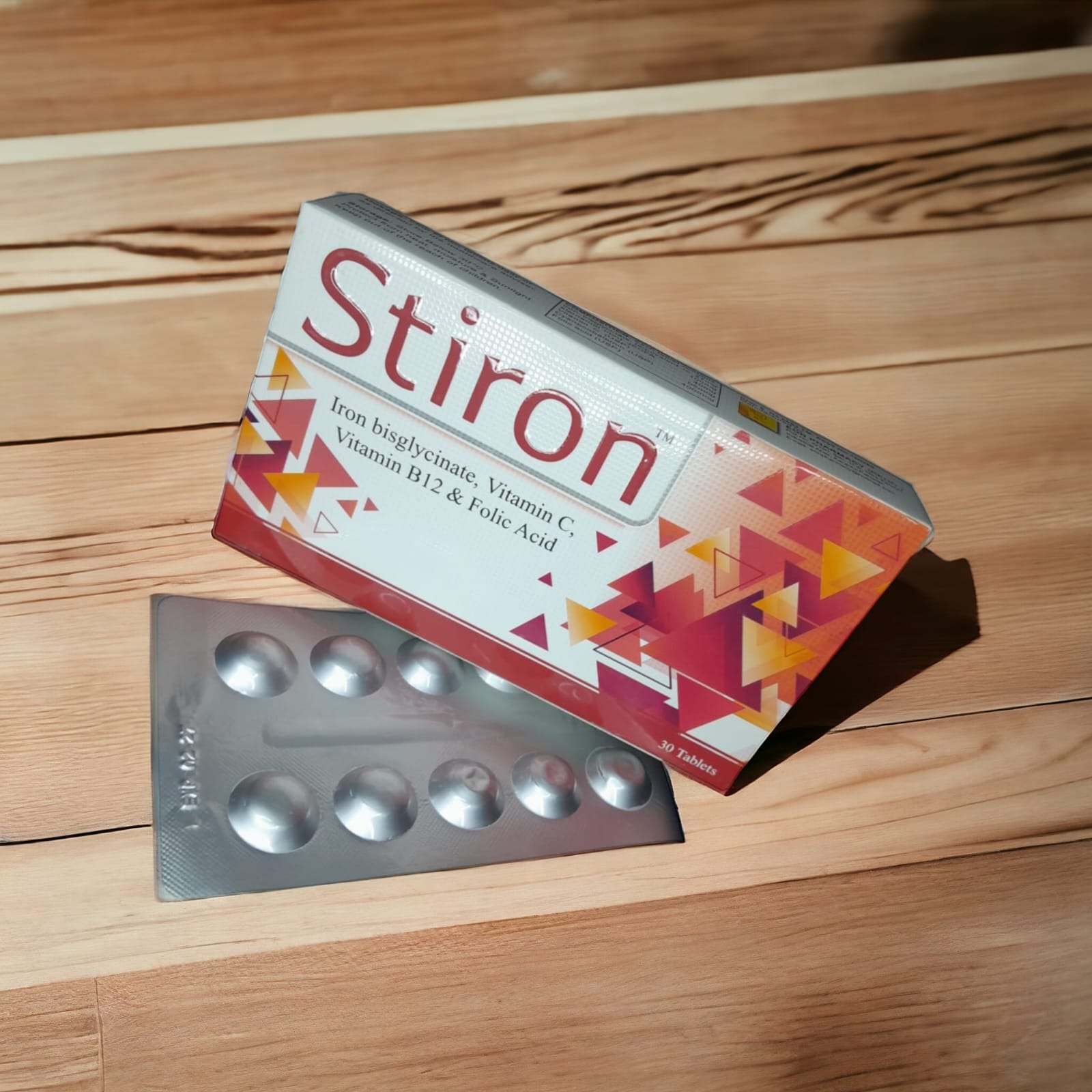 Stiron that helps treat iron deficiency anemia. It contains Iron bisglycinate, Vitamin C, Vitamin B12, and Folic Acid, which work together to support healthy red blood cell production, improve iron absorption, and promote overall health. It's commonly used to prevent or treat iron deficiencies, especially during pregnancy or in individuals with dietary gaps.